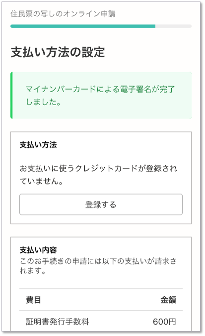 クレジットカードの登録後、登録したカード番号や今回のお支払い内容を確認して、[次へ進む]をタップしてください。